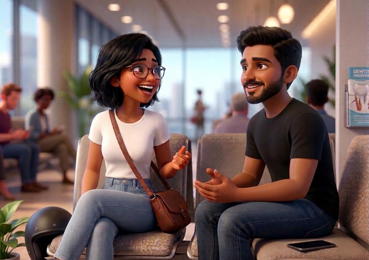 As she sat down, I could smell a faint hint of rain and shampoo. Our eyes met once, just for a second, but that was enough a strange spark passed between us. I quickly looked away, pretending to check my phone again, but I couldn’t help sneaking small glances at her. After a few minutes, she smiled and said something about how long the wait was. That one small sentence opened a floodgate and soon we were chatting like old friends. We talked about random things traffic, work, music, weekend plans, even about how dentists are scarier than horror movies. Every sentence felt light and easy, and every laugh felt real.