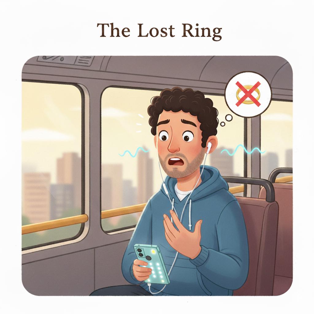 ಊಟದ ನಂತರ, ನಾನು ಆಫೀಸ್ನಿಂದ ಹೊರಟೆ. ಸಹೋದ್ಯೋಗಿಯೊಬ್ಬರ ಕಾರಿನಲ್ಲಿ ಒಂದು ಮಧ್ಯದ ಸ್ಥಳದವರೆಗೆ ಹೋಗಿ, ನಂತರ ಬಸ್ಸಿನಲ್ಲಿ ಮುಖ್ಯ ನಿಲ್ದಾಣಕ್ಕೆ, ಮತ್ತೊಂದು ಬಸ್ಸಿನಲ್ಲಿ ಮನೆಗೆ, ಮತ್ತು ಕೊನೆಯಲ್ಲಿ 20 ನಿಮಿಷ ನಡೆದು ನನ್ನ ಮನೆ ತಲುಪಿದೆ. ಆ ಇಡೀ ಪ್ರಯಾಣದುದ್ದಕ್ಕೂ, ನನ್ನ ಮನಸ್ಸು ಒಂದೇ ಒಂದು ಆಲೋಚನೆಯಲ್ಲಿ ಮುಳುಗಿತ್ತು: 'ನನ್ನ ಉಂಗುರ ಎಲ್ಲಿರಬಹುದು, ಮತ್ತು ಅದು ನನಗೆ ಎಂದಿಗೂ ಸಿಗದಿದ್ದರೆ ಏನು ಮಾಡುವುದು?!' ನಾನು ಮನೆಗೆ ಬಂದಾಗ, ತುಂಬಾ ಒತ್ತಡದಲ್ಲಿದ್ದೆ. ನನ್ನ ಹೆಂಡತಿ ನನ್ನನ್ನು ಸ್ವಾಗತಿಸಿ, ನನ್ನನ್ನು ಶಾಂತಗೊಳಿಸಲು ಕೆಲಸ ಹೇಗಿತ್ತು ಎಂದು ಕೇಳಿದಳು.
